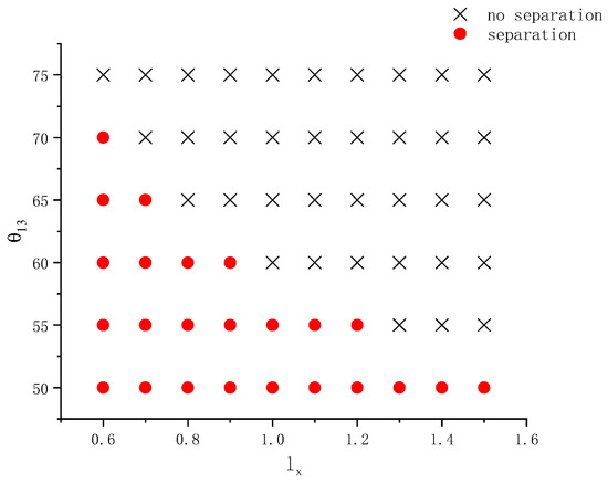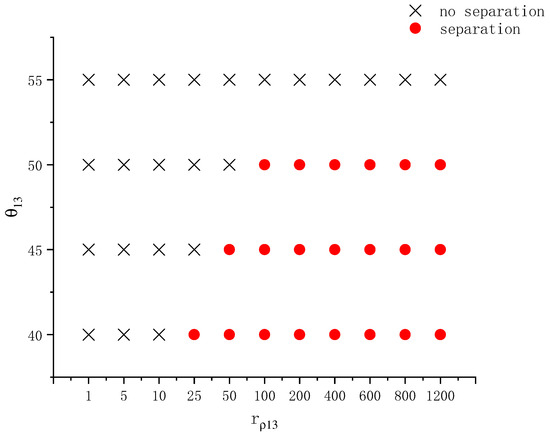 In addition to the wall properties and interfacial angles, the density ratio may also have certain impacts on the wetting behavior of a compound droplet. This section explores the influence of the density ratio of droplet to ambient fluid () on the separation behavior of Janus droplets. The interfacial angles are fixed at , , . The same prolate spheroid as above is used. In addition to , the contact angle is also varied. Other parameters are the same as those given in Section 3.3. Note that the kinematic viscosity ratio is fixed at . Thus, as the density ratio changes, the dynamic viscosity of the ambient fluid varies. Based on the simulation results using different combinations of and , another phase diagram on droplet separation on an ellipsoidal wall is established in Figure 13. From this figure, one can see that, in general, a larger density ratio is favorable for droplet separation at a given contact angle . A larger density ratio corresponds to a lighter ambient fluid. The dynamic viscosity of the ambient fluid is also smaller at a higher (with being the same). These two factors reduce the obstruction of the ambient fluid to the motion of the compound droplet, making droplet separation easier. From the results at , it is observed that when the contact angle is not small enough, droplet separation will not occur even if the density ratio is very large.