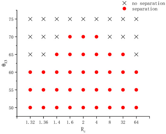 The above findings from Figure 12 may also be understood from the other side. That is, given the same change in the interfacial angle, the influence of the contact angle is smaller on the concave surface than on the ellipsoidal wall. This is because the wetting effect of the concave solid wall itself on the droplets has been relatively good, and the influence of continuing to enhance its wetting effect on the separation of droplets will not be too great. On the other hand, it can be seen from Figure 3a in Section 3.3 that when the droplets on the concave surface are separated, droplet 1 has been wetted on the wall to a considerable extent. The possibility of separation mainly depends on whether the liquid bridge between two droplets will break when droplet 1 spreads to the maximum on the solid wall; this condition is closely related to the interfacial angle, so the interfacial angle is the most influential factor in the process of droplet separation on the concave surface whose .