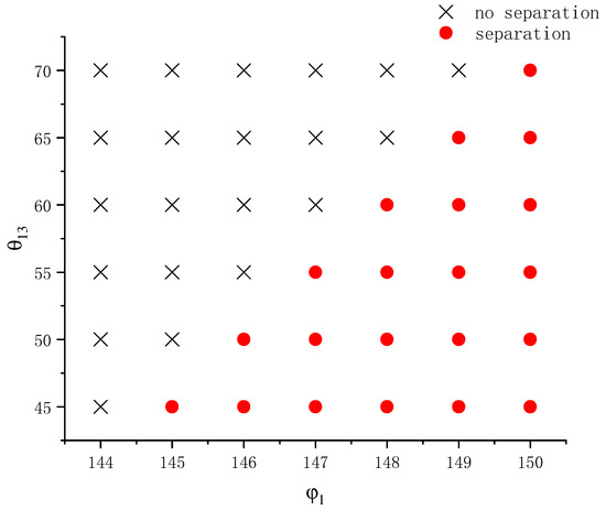 To know the effects of the interfacial angles and wall wettability on droplet separation in a broader parameter regime, a number of simulations on compound droplet wetting on the above prolate spheroid under different interfacial angles and contact angles were carried out. The interfacial angle varies from to , and the contact angle varies from to . Note that the difference between the first two interfacial angles () is fixed at . Other parameters are the same as those given before. Based on the simulation outcome, a phase diagram on whether droplet separation occurs during the wetting process is established in Figure 11. As shown in Figure 11, in general when the interfacial angle increases, the critical contact angle for separation increases. For instance, at , the critical contact angle is between and and at it is between and . These results indicate that, at a larger interfacial angle , the bond between the left and right droplets weakens and may be broken by the wetting on a less hydrophilic wall. Besides, the different variation ranges of the interfacial angle and contact angle in Figure 11 suggest that the interfacial angle has greater impact on the droplet separation phenomenon than the contact angle. While the separation phenomenon depends on both the intrinsic properties of both a Janus droplet, like the interfacial angles, and external factors, like the wall wettability, it seems that the former plays a more influential role than the latter.