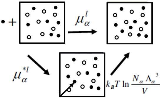 Recall that the chemical potential is the change in the Helmholtz or Gibbs energy for adding one particle to a system characterized by the variables or . The two terms in Equation (21) correspond to performing the same process of adding a new particle, in two steps; first, we add the new particle to a fixed position , and second, we release the particle from the fixed position. Clearly, due to the molecule collisions, the new particle will start to move, wander in the entire volume V, and will acquire a distribution of momenta as all the other N particles in the system at equilibrium. The corresponding changes in the Helmholtz (or Gibbs) energy are and . The latter is referred to as the “liberation” Helmholtz (or Gibbs) energy. This two-step process is shown in Figure 1. In Ben-Naim (1987 [1]), it was suggested to refer to the newly added molecule of species as the “solvaton”.