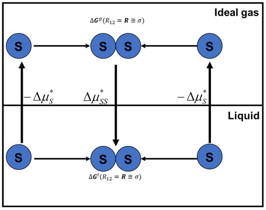 This relationship can be easily “derived” from Figure 3. We conduct the process of bringing the two solute particles (S) from infinite separation to some finite distance , then take the difference in the solvation Gibbs energies for the same process in the liquid and in an ideal gas phase, and we obtain: