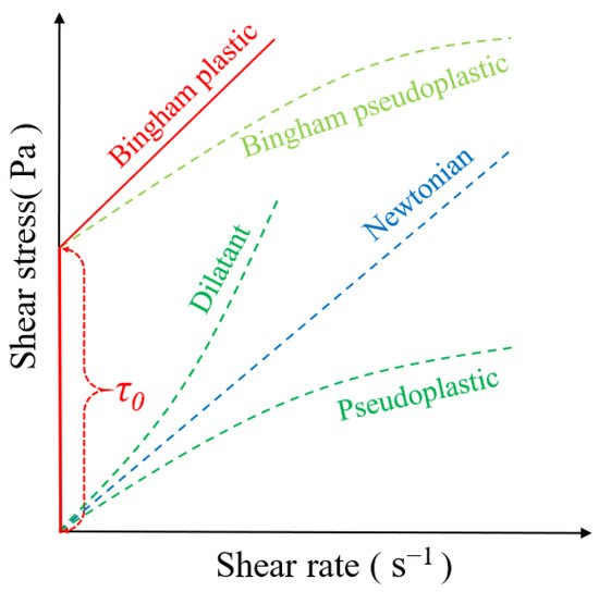 Bingham plastic fluid, as a form of Bingham fluid, exhibits rigid body motions under low stress. The fluid only begins to flow when the shear stress reaches a specific value, at which point the shear stress changes linearly with the shear rate. Bingham plastic fluids have intermediate properties between viscosity and rheological properties, commonly found in engineering materials. The shear stress of Bingham fluids can be described by the Herschel–Bulkley model as follows [22]: