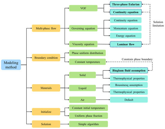 where Tf is the reference temperature for buoyancy flow. The second viscosity term is small and can be ignored in the model solutions [17]. The Bingham fluid is applied through the stress term in Equation (3), which limits the shear rate (or the deformation rate) of the solid phase by setting the shear stress. If the shear stress applied to the “solid phase” mesh does not exceed the threshold value, the fluid inside the mesh exhibits rigid motion. The boundary of the “solid phase” is transmitted to internal forces through stress terms, and the adjacent “solid phase” meshes also rely on this to transfer forces that behave like rigid motions. The meshes in the mushy zone are affected by the volume fraction α. This causes changes in the density, which can lead to the formation of forces generated by density differences with the surrounding meshes. Therefore, the macroscopic motion of the “solid phase” can be directly driven by the stress term.