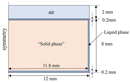 The calculation domain was established based on the experimental setup, which is shown in Figure 6. The two-dimensional computational domain was established in an axisymmetric form, corresponding to the working condition with 10 g of PCM. The computational domain includes three fluid regions: air, liquid phase, and “solid phase” at the initial point. Considering that the total volume of the PCM changes during the solid–liquid phase transition process, the air region was used as a buffer zone for fluid expansion. The bottom and side walls were assigned constant wall temperature conditions. In addition, to ensure the normal startup of the model, a thin liquid film region with a thickness of 100 μm was set up (without this setting, the model would not be able to start the calculations).