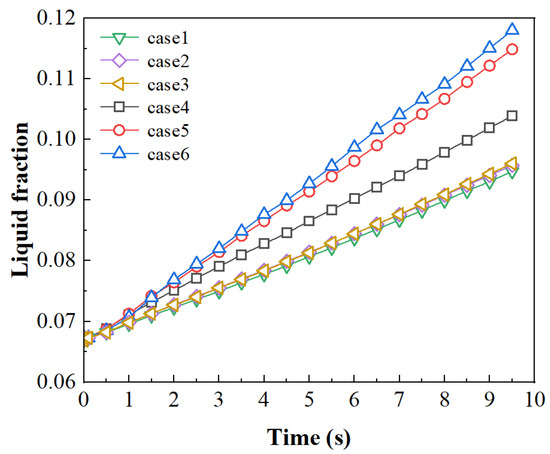 The melting condition and the phase properties that were used were consistent with case 1 in Section 3.3. The time step was set as 0.0005 s, consistent with the other calculation cases outlined hereafter. The change in the liquid-phase volume fraction within 10 s was used for the meshing independence analysis. Considering the magnitude of the computations, each time step was iterated 10 times, and each case mentioned above required approximately 200,000 iterations. The comparison results are shown in Figure 4. It can be seen that the results of cases 1–3 are very close. The total number of meshes between case 3 and case 4 show a difference of 63,000, but there is an obvious deviation in the prediction. This indicates that mesh independence begins to be reflected in the range between case 3 and case 4. Therefore, all the cases in this article adopted the mesh sizes of 0.02 mm for the global size and 0.01 mm for local refining.