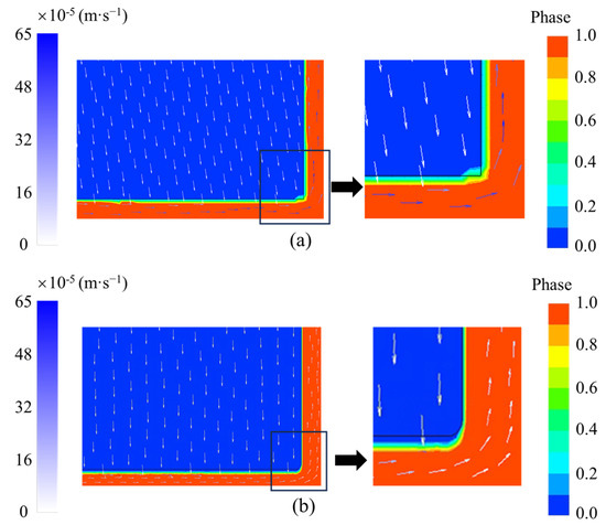 To illustrate the macroscopic settling performance of the “solid phase” with the Bingham fluid assumption, vector velocity distributions near the liquid film with and without the Bingham fluid assumption are shown in Figure 5. The mass transfer was not considered, and the right-angled area at the bottom of the “solid phase” was emphasized because, in this area, the liquid phase influences the direction of the flow, which may cause deformation of the “solid phase”. In our simulations, calcium dichloride hexahydrate (CaCl2·6H2O) was used as the PCM. The solid–liquid density difference was 168 kg m−3, which can drive the macroscopic settling of the “solid phase”. It can be seen in Figure 5 that the Bingham fluid assumption (with a threshold shear stress of 100 Pa) can effectively control the flow deformation of the “solid phase”. Furthermore, the selected threshold shear stress is larger than the pressure difference at the solid–liquid interface, which must be considered and pre-estimated in simulations.