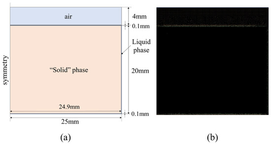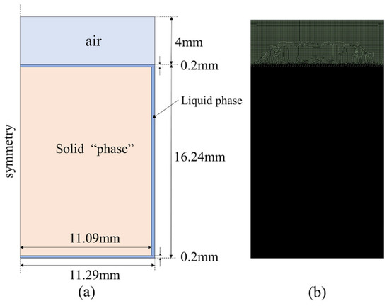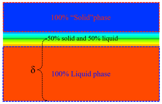 The measurements and simulation values of the thickness of a thin liquid film are related to the width of the mushy zone. The mushy zone is composed of a partial liquid and partial solid phase. To the best of our knowledge, there is currently no clear method for determining the simulated value of thin liquid-film thickness. Therefore, according to both our simulation results and the experiments of Hu et al., the simulated thickness values were determined by measuring the middle position of the mushy zone, i.e., the 50% volume fraction. The detailed determination method can be seen in Figure 10.