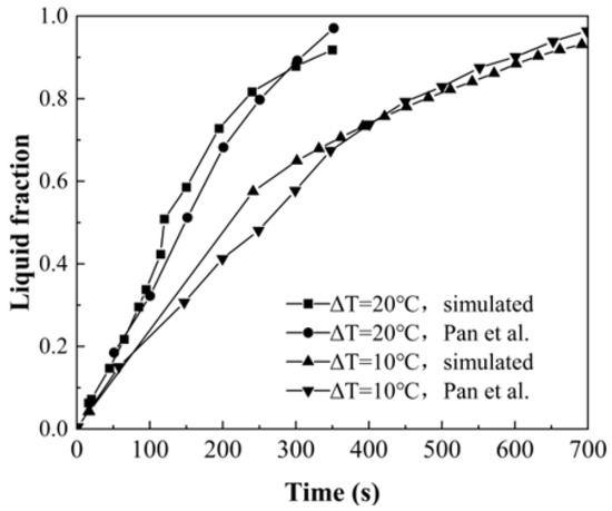 Figure 7 shows the comparison of the simulated results and the experimental measurements reported by Pan et al. [15] on the variation in the liquid-phase volume fraction over time at the driving-temperature difference of 10 °C and 20 °C. By using the root mean squared error (RMSE) method (shown in Equation (8)), the deviations between the experimental and simulated data were obtained as 7.68% (ΔT = 20 °C) and 10.88% (ΔT = 10 °C).