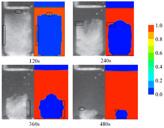 Figure 8 shows the comparison of the melting patterns from the experimental images and simulations with the driving-temperature difference of 20 °C. The compared liquid–solid phase change interfaces with similar shapes are highlighted by using the dash rectangles and circles. It can be seen that a convex and nonuniform phase boundary appears at the top of the PCM solid phase, which may relate to the fluidity of the liquid phase. A similar phenomenon was also observed in the simulation. The predictions of both the volume fraction and phase distribution demonstrate the consistency between the model and the experiments.