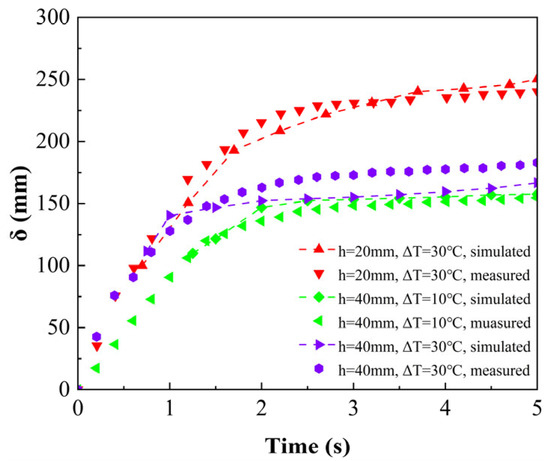 Figure 11 shows the comparison results of the thin liquid-film thickness within 5 s (the most obvious variation stage of the thickness) in the melting process at driving temperature differences of 10 °C and 30 °C. The initial heights of the PCM solid phase of 20 mm and 40 mm were also considered. It can be seen that the thickness variation trend and the magnitude were all consistent with the experiment. It is worth noting that the initial time point of the simulation was corrected through the predicted initial thickness with the experimental value. Therefore, the thickness values at subsequent moments could be compared. At the beginning of melting, the thickness of the liquid film increased rapidly, and after 2 s, the rate rapidly slowed down. Moreover, a lower driving-temperature difference and a higher initial height of the PCM solid phase resulted in a thinner liquid film. This change trend can also be found in the literature [23], which proves that the model has good consistency.