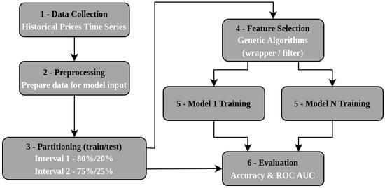 The proposed methodology can be seen in Figure 1, below, which summarizes the following steps: data collection, data preprocessing, data partitioning between training and testing, feature selection, training of each model, and the evaluation of the models.