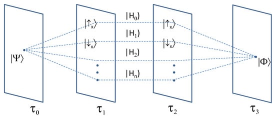As an example of (a separable) MTS, we can consider the following state: . This multiple-time state represents an initial eigenstate of the Pauli-X operator evolving forward in time from until a collapse into an eigenstate of the Pauli-Y operator occurs at time . Later on, at time , the system is projected again onto a different eigenstate of the Pauli-X operator. Finally, at , the system is measured in the Z basis, and the resulting eigenstate evolves backward in time. In the following, we will focus on two-time states (sometimes called two-states), which consist of a forward evolving state and a backward evolving state in the above form , to achieve a richer description of a quantum system during the time interval [21].