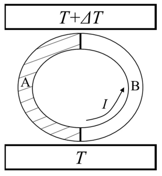 Let us go back to Kelvin’s quasi-thermodynamic argument for deriving the Kelvin relation. Kelvin proposed a thermoelectric circuit composed of two kinds of materials, A and B, as shown in Figure 1. The two junctions between the two materials are in contact with heat sources at different temperatures [15]. Kelvin argued that in a complete cycle of a perfectly reversible kind, the quantities of heat which it takes in at different temperatures are subject to a linear equation, of which the coefficient is the reciprocal of the temperature [16]. Thus, for this thermoelectric circuit that does not take into account any irreversible factors, the contributions to heat from the Peltier effect and from the Thomson effect cancel each other out [17]: