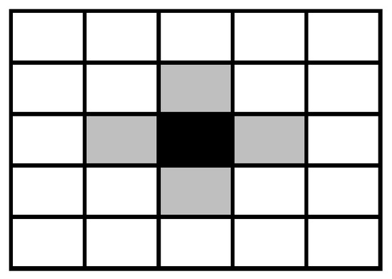 The agents inhabit a two-dimensional lattice represented by an matrix with periodic boundary conditions (that is, the upper and lower edges are joined and the left and right edges are also joined, in order to avoid edge effects). Each one of agents lives in a cell of this matrix and interacts with the four nearest agents (the north, east, south, and west neighbors), as illustrated by Figure 1. In cellular automata literature, this connectivity pattern is known as the von Neumann neighborhood of unit radius [46] and it has been employed in theoretical investigations on the Ultimatum Game [15,23,32,33,34,36].