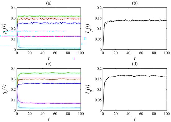 Similar metrics based on information entropy have been used to analyze the dynamics of complex systems [52,53,54,55,56,57]. Plots of and reveal how the heterogeneities in agent variability and resource allocation evolve as time passes.