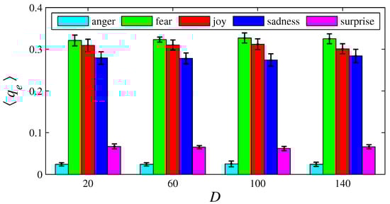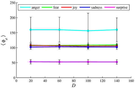 The histograms of in function of D, for {anger, fear, joy, sadness, surprise}. Here, , , , , , and {20, 60, 100, 140}. The black error bars represent the standard deviations.