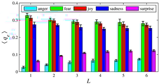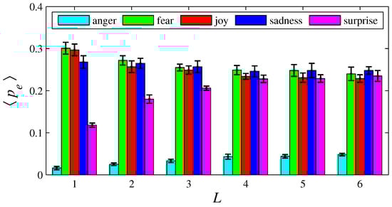 The histograms of in function of L, for {anger, fear, joy, sadness, surprise}. Here, , , , , , and {1, 2, 3, 4, 5, 6}.