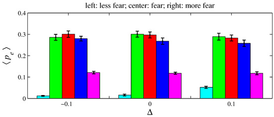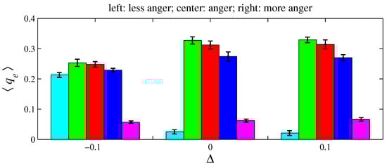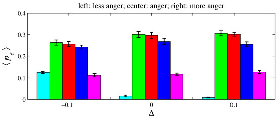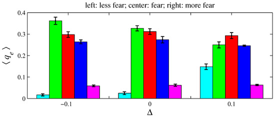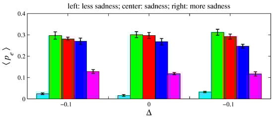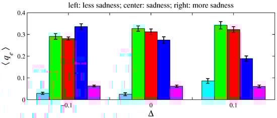 Figure 12, Figure 14, and Figure 16, respectively, indicate that playing with less anger, less fear, or less sadness increases the accumulated resources by angry agents, fearful agents, and sad agents, respectively. This conclusion can be drawn by observing the cyan bars in Figure 12, the green bars in Figure 14, and the blue bars in Figure 16. According to Figure 11, the percentage of angry agents decreases with ; according to Figure 13 and Figure 15, the percentages of fearful agents and sad agents are not noticeably affected by . In Figure 11 and Figure 12, the average inhomogeneities and increase with ; in Figure 13 and Figure 14, these inhomogeneities decrease with ; in Figure 15 and Figure 16, these relations are not monotonous.