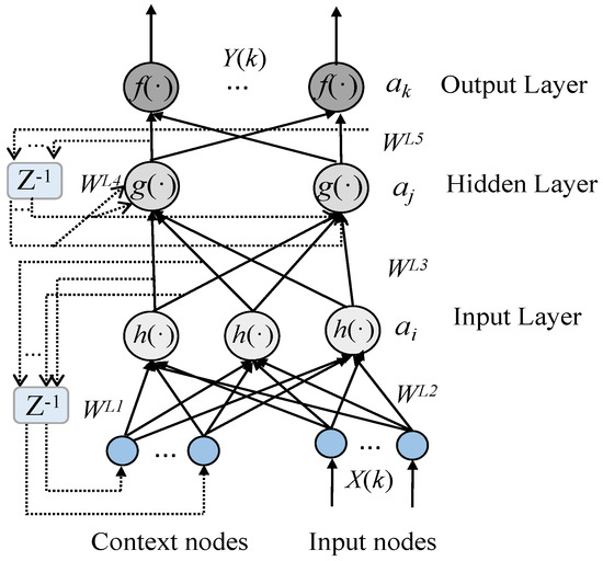 The Elman neural network is a type of recurrent neural network (RNN) that is used for time series prediction and sequence modeling [28]. It has a feedback loop that allows information from previous time steps to be fed back into the network, enabling it to capture temporal dependencies in the input sequence.