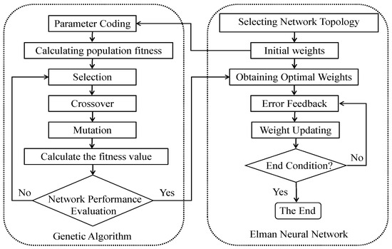The GA-Elman algorithm [29] is a hybrid approach that combines the Elman recurrent neural network with an adaptive genetic algorithm to optimize the network’s parameters for time series prediction. The main idea is to use the genetic algorithm to search for the optimal combination of weights and biases in the Elman network to minimize the prediction error. The algorithm starts by initializing the Elman network with random weights and biases. The training data are then fed into the network, and the output is computed. The genetic algorithm is used to optimize the weights and biases based on the prediction error. The genetic algorithm creates a population of candidate solutions, which are evaluated based on their fitness, i.e., how well they minimize the prediction error. The fittest solutions are selected for reproduction, and their offspring inherit their genetic traits through crossover and mutation. The Elman network is trained using the optimized weights and biases, and the process is repeated until the prediction error converges or the maximum number of iterations is reached. The trained network is then used to predict future values of the time series. The GA-Elman algorithm has several advantages over other time series prediction methods. It can handle nonlinear and non-stationary time series, and it can adapt to changing environments. The genetic algorithm allows for a global search of the parameter space, which can lead to better solutions than gradient-based methods.