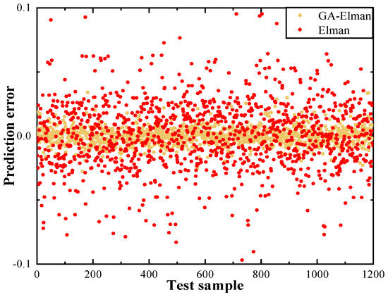 The transmittance prediction of the Elman and GA-Elman algorithms on transmission can be seen in Figure 5. To provide a quantitative analysis of the performance improvements made to the Elman algorithm, we present the prediction errors of GA-Elman and Elman for 1200 sets of test samples, as shown in Figure 6. Prediction error refers to the difference between the value of the transmittance output of the predicted model and the real value when we input the depth and distance.