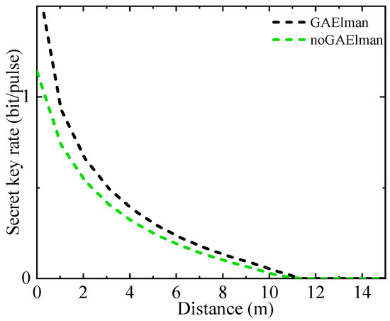 In what follows, we demonstrate the performance of the CV-MDI QKD system in terms of the secret key rate and transmission distance. In numerical simulations, we set the average number of output photons to 800 per pulse and the modulation variance to 60. For simplicity, we assume that the homodyne detector is noiseless and has an efficiency of 0.95 [15]. The communication block size is , and thermal noise ∼∼ 1.01. Depending on the distance between Alice and Bob, and Charlie, it can be classified as asymmetric and symmetric. It is worth mentioning that the system performs better in the asymmetric case when Alice and Charlie are closer to each other than in the symmetric case. Therefore, we will only present the performance in the former case.