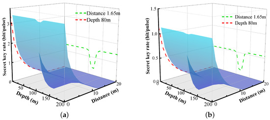 The variation relationship between the secret key rate as the dependent variable and the transmission distance and depth as the independent variables is shown in Figure 8.