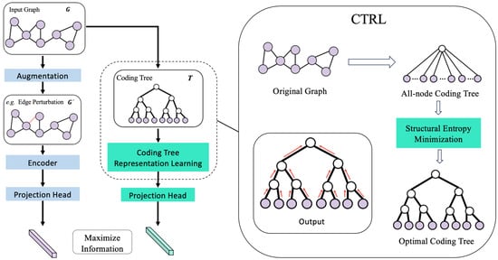 Contrastive learning has demonstrated its effectiveness in various domains, including computer vision [,,], natural language processing [,], and graph representation learning []. Specifically, in the context of graph representation learning, graph contrastive learning (GCL) [] has proven to be a valuable approach. GCL boosts the performance of downstream tasks by pre-training a Graph Neural Network (GNN) on extensive datasets, often characterized by limited or absent annotations. This method has evolved into a practical self-supervised learning technique for effectively capturing graph representations.
