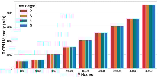 To evaluate the scalability of the proposed approach, we conducted an in-depth analysis of the GPU memory efficiency of CtrlGCL on Erdos–Renyi graphs []. In line with the methodology employed in prior research [], we generated Erdos–Renyi graphs by modulating the number of nodes n while maintaining the edge size m at twice the number of nodes . As depicted in Figure 2, our CtrlGCL demonstrates high memory efficiency, attributable to the computational efficiency of the tree encoder. This characteristic renders it particularly practical for large-scale graph applications. Notably, a comparison of memory usage across different tree heights with the same graph size reveals that the GPU memory consumption remains relatively constant, further underscoring the scalability of our proposed approach.