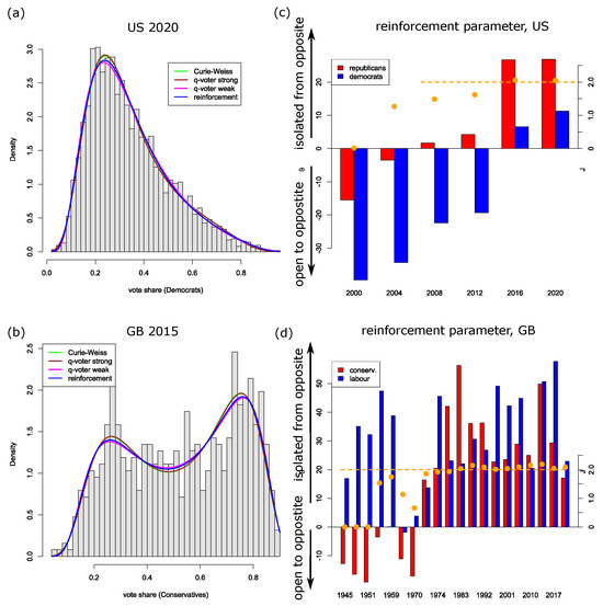 In the second part, we analyze election data from the United States (US), United Kingdom (UK), France (FRA), and Germany (GER) based on four opinion dynamics models (the Curie–Weiss model, the weak and strong effects continuum limit of the q-voter model, and, additionally, the weak effects limit of the reinforcement model [21]). We use this analysis to test the models to find out to what extent they are able to describe the data not only qualitatively, but also quantitatively. The central finding is that models derived by a weak effects limit perform much better than their strong version. Potentially, these findings will be useful for future empirical studies. In the last part, we again change the focus and turn to the interpretation of our results in the light of political science. In particular, political processes and changes in social interactions potentially leave their traces in the election data, and therewith in the estimated parameters. However, this conjecture can only be confirmed based on in-depth political research. These considerations lead us to another important aspect, which is the question of the extent to which socio-mathematical models of this kind can also be a fruitful instrument as an integral part of political science, or whether the methods, objectives, and research questions of socio-mathematics and socio-physics on the one hand and political science on the other are too different.
