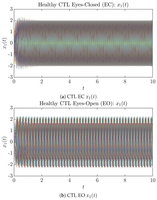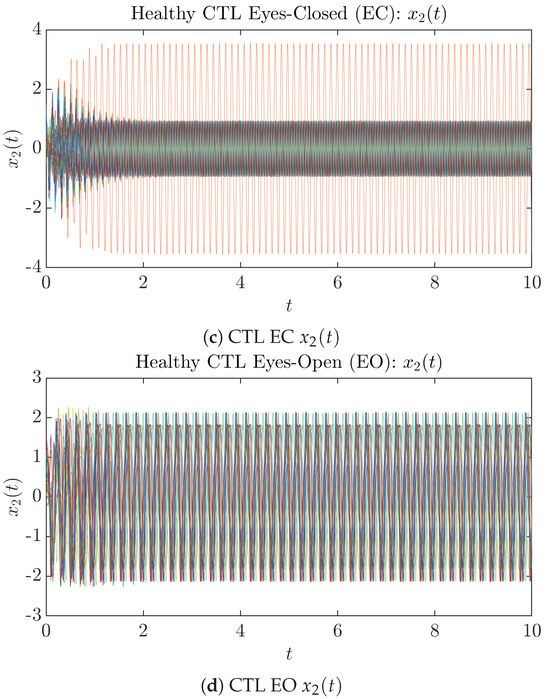 By using actual EEG signals, Ref. [1] utilized a combination of several different statistical and optimization techniques to fine tune the parameters in the model equations for eyes-closed (EC) and eyes-open (EO) conditions of both healthy control (CTL) subjects and Alzheimer’s disease (AD) patients, and these parameter values for different conditions are summarized in Table 1 and Table 2.