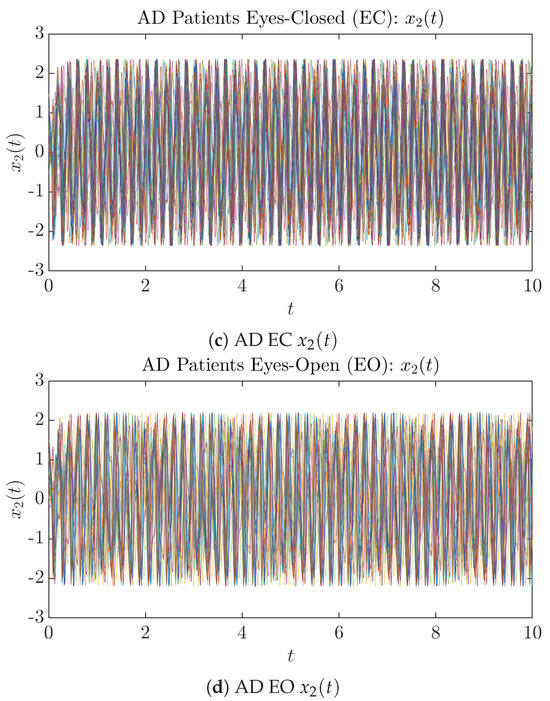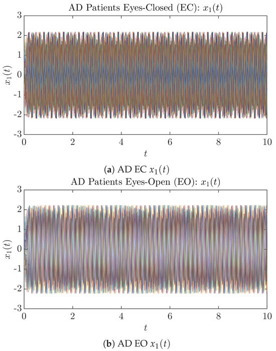 Moreover, when plotting EC and EO of healthy subjects separately in Figure 9a to zoom into the ranges of and for EO, one can also see that the phase portrait of EO exhibits a fractal-like pattern, whereas the phase portrait of EC exhibits more regular dynamical features, including an overall trend of fluctuating between bottom left and top right, indicating that the and are somewhat synchronized, which could be explained by the strong coupling coefficients in Table 1 of healthy subjects. Contrarily, for AD patients, the phase portraits of EC and EO both exhibit fractal-like patterns in Figure 9b.