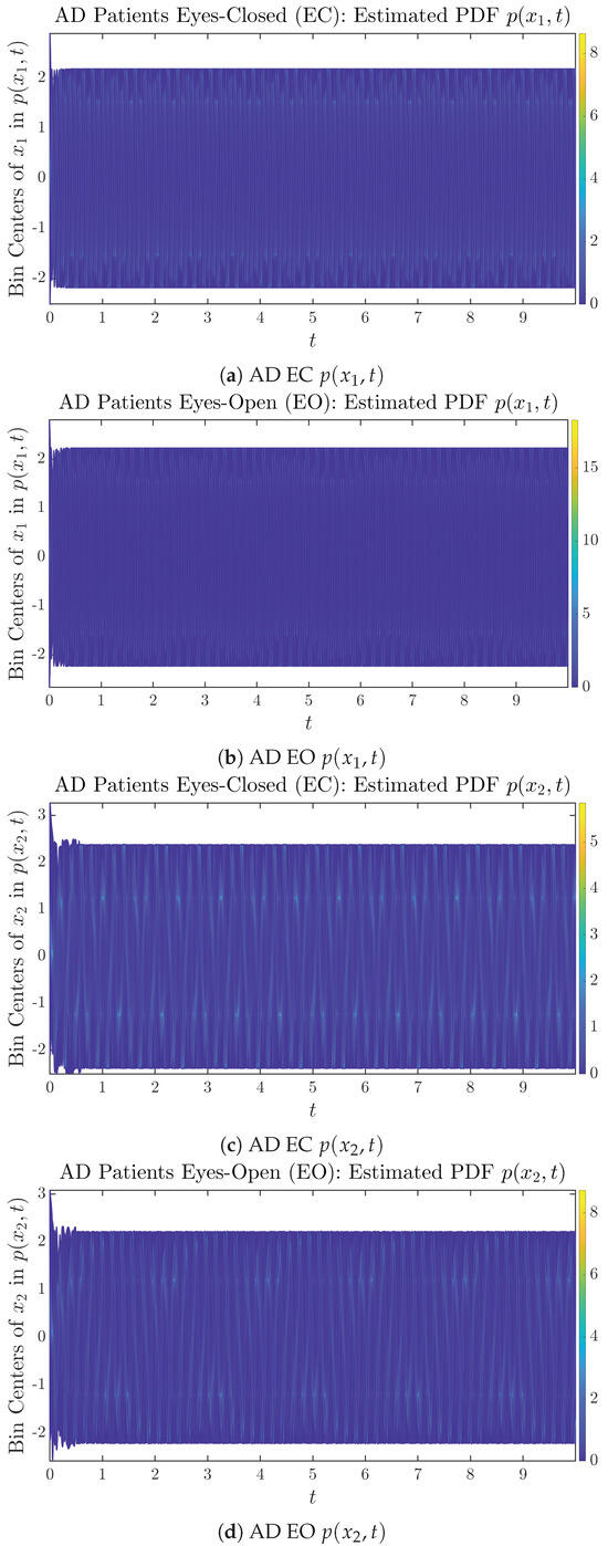 The statistics of and can be further and better visualized using empirical probability distributions of them, as shown in Figure 6. Again, we use histogram-based density estimation with Rice’s rule, and since the time interval for estimating PDFs and computing and is (whereas the time-step size for simulating the SDE model is ), we collected 24,999 samples of both and for , and hence, the number of bins following Rice’s rule is rounded to 58. Figure 6 confirms the observation in the previous section, while it also better visualizes the sample standard deviation in the shapes of the estimated PDFs, indicating that the PDFs of both and are narrowed down when healthy subjects open their eyes but are widened when AD patients do so.