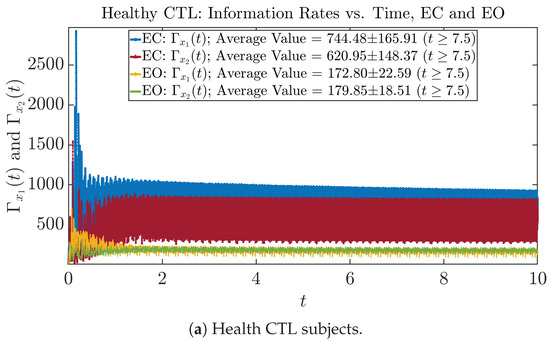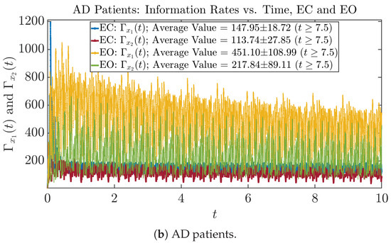 The time evolution of information rates and are shown in Figure 5a,b for CTL subjects and AD patients, respectively. Since and quantify the (infinitesimal) relative entropy production rate instantaneously at time t, they represent the information-theoretic complexities of signals and of the coupled oscillators, respectively, and are hypothetical reflections of neural information processing in the corresponding regions in the brain.