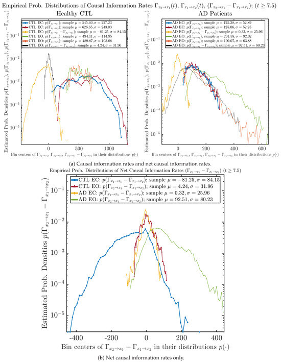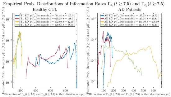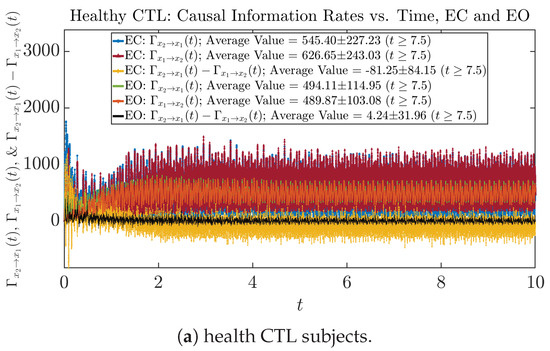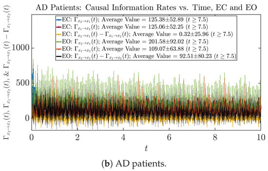 From Figure 3 and Figure 4, one can already observe some qualitative differences between healthy control (CTL) subjects and AD patients. For example, the time evolution patterns of and are significantly different when CTL subjects open their eyes from eyes-closed (EC) state, whereas for AD patients, these differences are relatively minor. One of the best ways to provide quantitative descriptions of these differences (instead of being limited to qualitative descriptions) is using information geometry theoretic measures such as information rates and causal information rates, whose results are listed in Section 3.3 and Section 3.4, respectively.