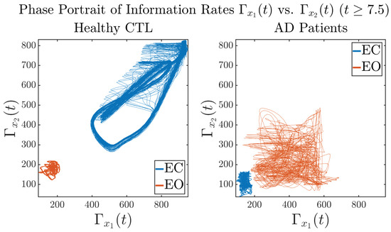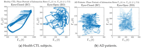 In addition to empirical statistics of information rates for in terms of estimated probability distributions, one can also visualize the temporal dynamical features of and combined using phase portraits, as shown in Figure 8. Notice that when healthy subjects open their eyes, the fluctuation ranges of and shrink by roughly 5-fold, whereas when AD patients open their eyes, the fluctuation ranges are enlarged.