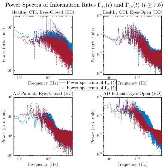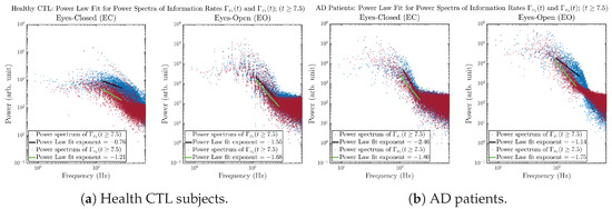 The power spectra of and also exhibit a clear distinction between EC and EO for CTL and AD subjects. Specifically, the power spectra of and can be fit by power law for frequencies between ∼100 Hz to ∼1000 Hz (the typical sampling frequency of experimental EEG signals is 1000 Hz, whereas most of brain wave’s/neural oscillations’ frequencies are below 100 Hz). From Figure 11a, one can see that power law fit exponents (quantifying how fast the power density decreases with increasing frequency) of ’s and ’s power spectra are largely reduced when healthy subjects open their eyes, which indicates that the strength of noise in and decreases significantly when switching from EC to EO. Contrarily, for AD patients as shown in Figure 11b, the power law fit exponents of ’s and ’s power spectra increase significantly and slightly, respectively, indicating that the strength of noise in and increases when switching from EC to EO.