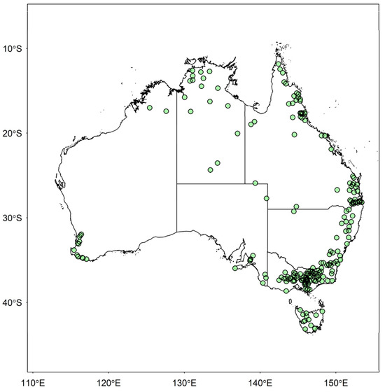 In the present study, the streamflow time series from a large number of streamflow monitoring stations in Australia are used for the purpose of classification of the catchments. Australia is the driest among all the continents, having a low annual rainfall (with a mean of 451 mm/year), high mean annual temperature (21.5 °C), high evaporation rate, and low annual runoff (with a mean annual runoff coefficient of 12%) [25,57]. The continent experiences a wide range of climatic conditions, with a large part of central and western Australia being characterized by an arid and semi-arid climate, the northern region by a tropical climate, and the south-eastern and south-western regions showing a temperate climate [58,59,60]. Australian catchments are generally characterized by their low topography (mean elevation is 330 m above sea level with a maximum elevation of 2745 m above sea level), typically ‘peakier’ flows, low base flows, smaller runoff coefficients, elongated dry periods, and large temporal variations in runoff [25,61,62].
