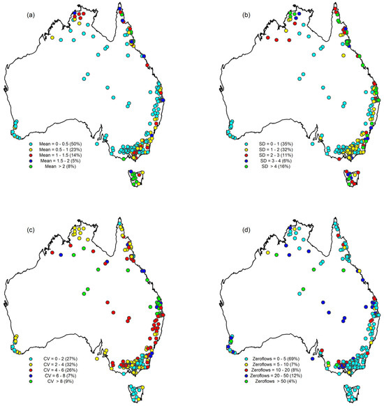 Daily streamflow statistics of the 218 stations used in this study: (a) Mean (MLD); (b) Standard deviation (MLD); (c) Coefficient of variation; and (d) Percentage of zero flow days (values inside parentheses represent the percentage of stations, rounded off to the nearest integer).