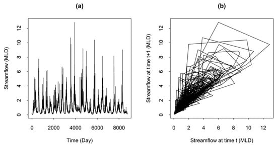 Daily streamflow from Station #401012: (a) Time series; and (b) Phase space diagram.