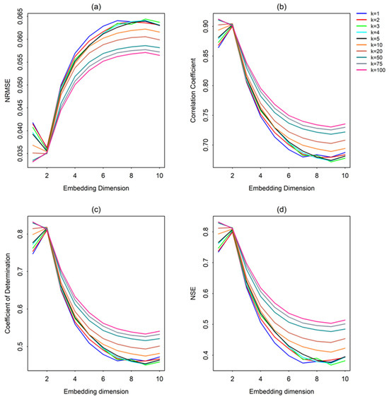 As seen from Figure 4, the prediction accuracies are higher for lower embedding dimension values (up to m = 2), gradually deteriorate when the embedding dimension is increased up to a certain point (up to m = 6 to 8, as appropriate for different k), and finally reach some kind of saturation (or only slightly improve) beyond that point. These generally low m values yielding better predictions seem to suggest the possible presence of chaos in the streamflow time series [64,65]. The deterioration of the prediction results at embedding dimensions higher than 2 is more likely to be an indication of the influence of the presence of noise in the data, as noise propagates more at higher dimensions (i.e., greater than the optimal dimension) and, hence, leads to declining prediction accuracy. Similar results (i.e., low m values yielding better predictions) have also been reported by many past studies on streamflow and other hydrologic data from other parts of the world [52,55,65].