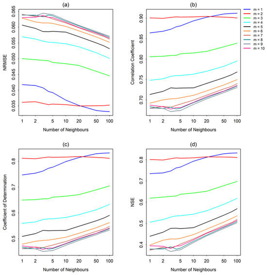Figure 5a–d show the four prediction accuracy measures against the number of neighbors for different m values (i.e., m from 1 to 10). The plots show that the prediction accuracy, in general, slightly improves with an increase in the neighborhood size up to k = 5, and then there is a relatively rapid improvement for higher k, which, nevertheless, is still small enough considering the total number of neighbors. These results (i.e., a relatively small providing the best predictions) also indicate chaotic behavior in the time series [66,67]. This behavior for the streamflow time series from Station #401012 is also consistent with the results reported by past studies for streamflow and other hydrologic data from other regions of the globe [65,68].