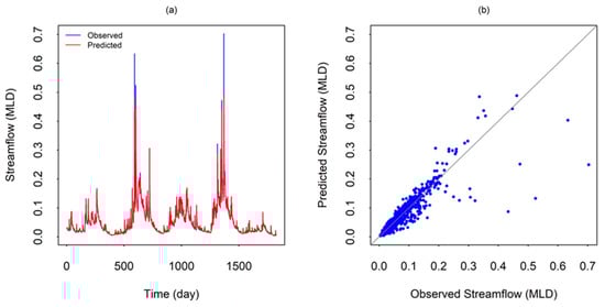 Comparison of predicted and observed streamflow values for Station #401012: (a) Time series; and (b) Scatter plot. The predicted values correspond to those obtained using embedding dimension (m) = 1 and number of neighbors (k) = 50.