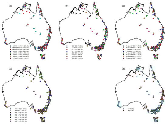 Figure 7 presents the classification of the 218 stations based on the four prediction accuracy measures (Figure 7a–d) and the optimum embedding dimensions (Figure 7e). Considering the NRMSE-based classification (Figure 7a), for example, the results indicate that stations with the lowest NRMSE values are mainly located across the inland areas near the border between Queensland and South Australia, southern coast, south-east coast, and a few in the eastern coast, and the far north of Western Australia. Stations located in the south-west coast, Northern Territory, and the eastern part of Australia show low to medium ranges of NRMSE values. Stations in Tasmania are mostly less predictable in terms of their prediction measures. When the classification is done based on correlation coefficient (Figure 7b), results show that stations in the Northern Territory, south-west coast, south-east coast, north-east coast, and Tasmania show relatively higher ranges of CC, while low to medium ranges of CC are observed for eastern-coast stations. Similar results are obtained for classification based on NSE (Figure 7d). For R2-based classification (Figure 7c), stations with the lowest NRMSE values are mainly located across the eastern coast, whereas the south-west coast stations show higher R2 values, and most of the stations across the Northern Territory, south-east coast, and Tasmania show medium to high ranges of R2 values.