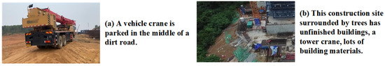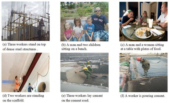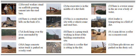 To generate the image description for the construction scenes, we use the public construction scenes image dataset MOCS as the foundation and select 5000 images from the MOCS dataset to annotate with a description sentence according to the specific scene content. Some examples of description sentences are shown in Figure 4. The constructed dataset covers 12 kinds of common objects, reflecting the construction site’s real situation. A total of 60% of the image-text pairs in the dataset are randomly selected as the training set, comprising 3000 image-text pairs. The remaining 40% are selected as the test set to verify the training effect of the model. Due to the limited amount of training data, the model is initially pre-trained on the MSCOCO dataset. MSCOCO contains 123,287 images, each with five reference captions. According to the Karpathy segmentation setting [35], 113,287 images are used for training, 5000 for verification, and 5000 for testing.