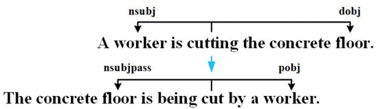 Due to the small amount of training data, we perform data enhancement to improve the robustness of model training. Referring to the idea of [36], based on the dependency tree of a sentence, the sentence is transformed according to the rules. For example, the subject and object of the original sentence are exchanged. And the sentence is changed from the active voice to the passive voice. As shown in Figure 5, by changing a sentence from the active voice to the passive voice, the worker is changed from the subject to the object and the floor changes from the object to the subject. Compared with the original text, the augmented data generated by sentence transformation at the sentence level has noise related to sentence patterns, which enhances the complexity of the text and makes the model more robust while keeping the semantics of the data unchanged.