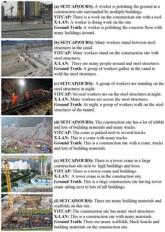 Figure 6a–c all have specific scene activities, and generated descriptions are more detailed. Figure 6d–f are similar to an aerial view, without specific scene activities, and generated descriptions are more of an overall overview, indicating that the model can grasp the semantic style of the image. Figure 6a has a complex background, and our model can also capture the movement of workers polishing the ground, but other models do not reason about specific work activity; Figure 6b shows that our model successfully detects both the small target, “steel bars”, and the overall environment, “canal”, whereas other models fail to identify the latter. Figure 6c shows that in low-light conditions at night, our model outlines multiple workers standing at a complex construction site, providing more detailed results compared to other models; Figure 6d–f show the reasoning ability of our model under complex scenarios. Compared with other models, our model can understand the style of the image better, and the generated sentence is closer to the reference sentence.