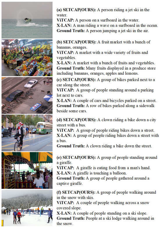 Figure 7 demonstrates that in a normal scene, regardless of the complexity or simplicity of the background, our model exhibits superior proficiency in capturing the primary subjects and occurrences depicted within the image. Moreover, the generated sentences remarkably align with the provided reference sentences, therefore showcasing a higher degree of fidelity. Specifically, Figure 7a shows that our model generates a sentence that more accurately describes the ‘jet ski’, closer to the reference sentence. In Figure 7b, our model captures greater detail of both the environment and fruit species compared to other models. Furthermore, in Figure 7c–e, our model selects the subject and object more accurately, resulting in a sentence that is more similar to the reference sentence. Finally, in Figure 7f, our model provides a more precise description of the environment.