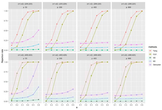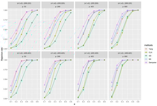 We assess the finite sample performance of our proposed test (denoted by ) in comparison with tests introduced by [5] (denoted by ), [4] (denoted by ), [6] (denoted by ), and [8] (denoted by ). All tests in our simulations are conducted at the significance level with 1000 Monte Carlo replications, and the number of bootstrap replications is set to 1000. We consider dimensions and sample size pairs .