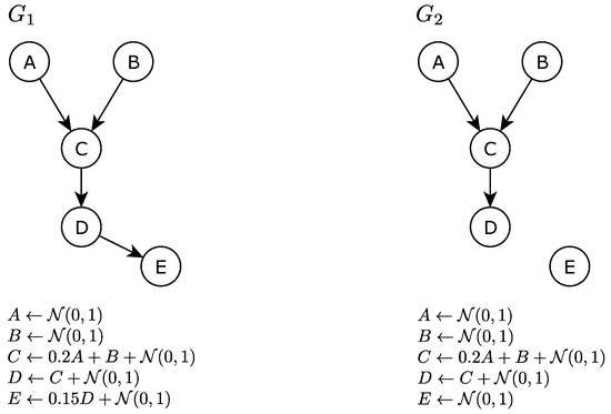 represents the set containing the parents of , as specified in the DAG. , the coefficient of each parent of , is the multiplication of a uniform random variable and a Bernoulli random variable, as follows: , where , , and . This procedure resulted both positive and negative relationships in the data generation process and a range of effect sizes (for the distribution of the effect sizes, see the Supporting Information). The effect sizes explored in the current study are mainly small () to median () effect sizes [47,48]. is computed for each , such that the marginal variance of is one. A marginal variance of one is not always achievable (i.e., in some cases, the variance of exceeds one before is added); in these cases, a new DAG is generated and new parameterization is attempted.